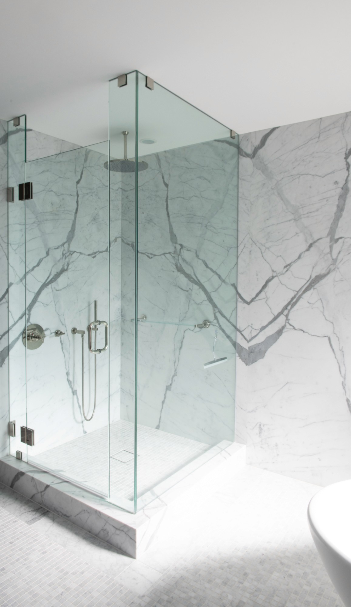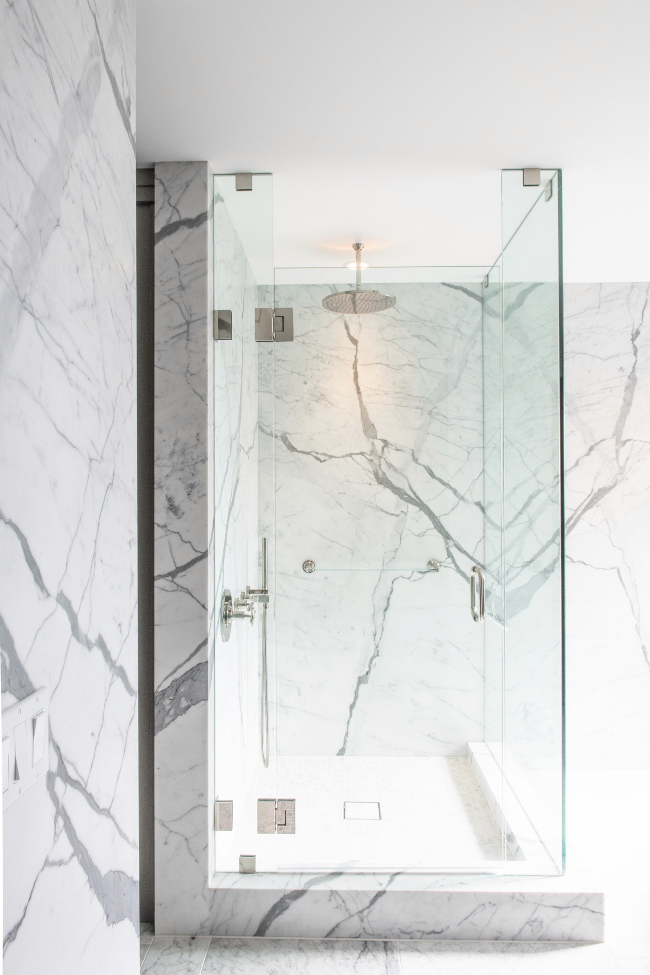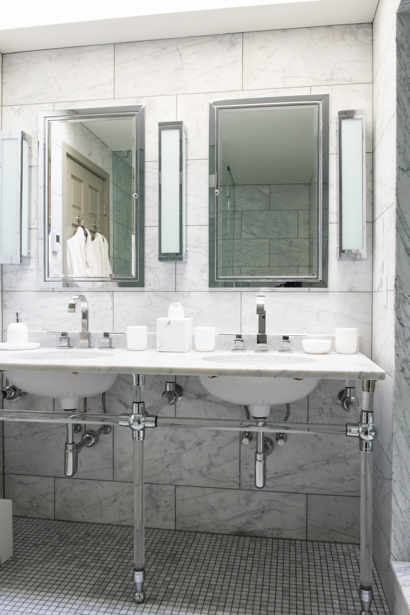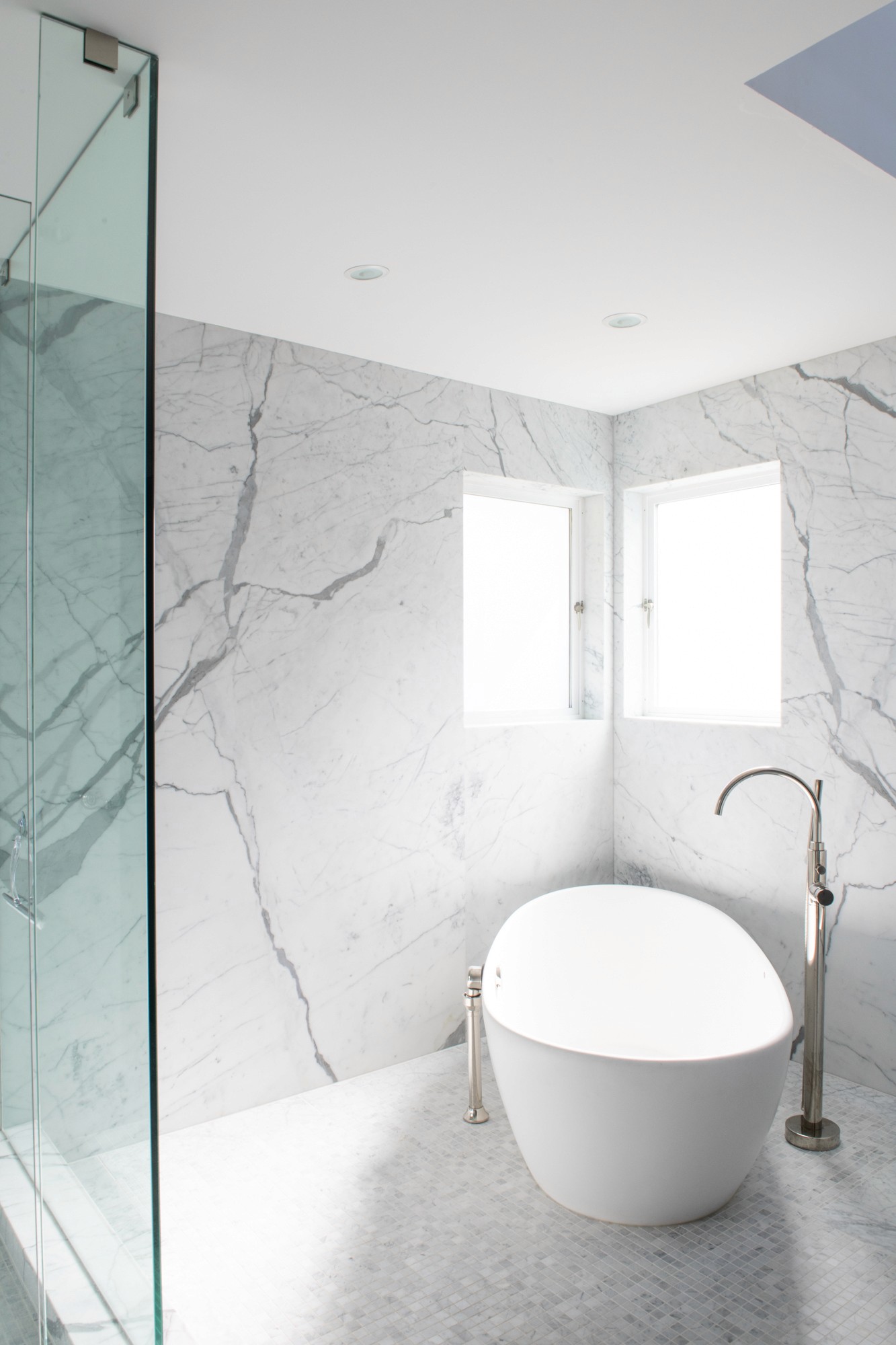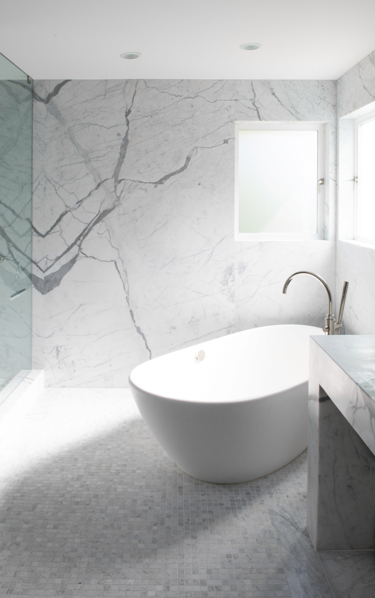 A clean marble infused bathroom highlighted by natural light.